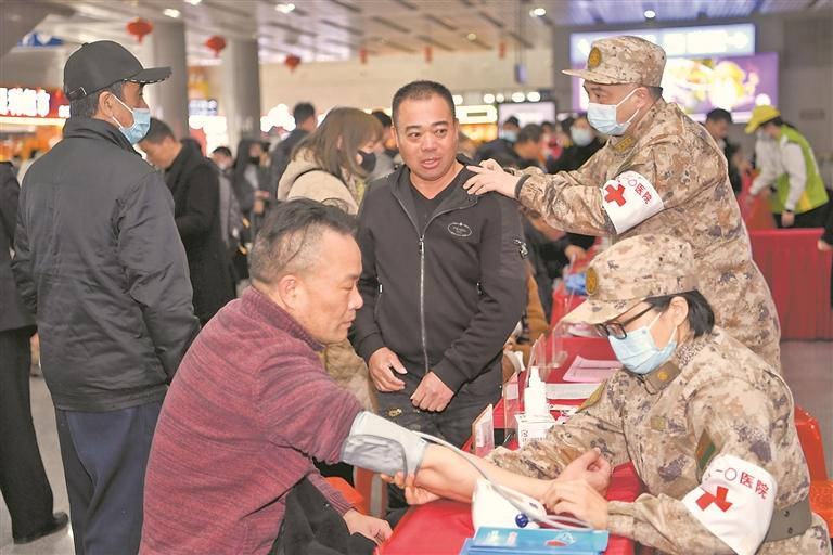 昨日是2024年春运第一天,为确保旅客健康平安返乡,联勤保障部队第910医院组织医务人员前往泉州火车站,现场驻点保障并开展义诊活动,免费为返乡旅客赠送药品。(苏凯芳 巴涛 摄)