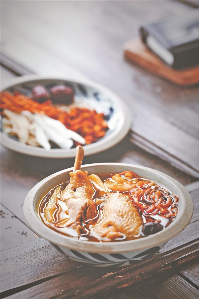 不一会儿,“三大碗”先后上桌,大红漆碗描金带莳绘,外搭一把木头小勺子和一双竹筷,非常有仪式感。浅酱色的老鸭汤热气腾腾,浮油泛金,给降温的冷冬增添了些许暖意。低头一瞧,只见碗中全是“硬货”,仅是鸭腿肉就占了汤碗里三分之一的地盘,如梭状的枸杞在碗中“游走”,中间还有一些葱花点缀增色,这的确是传统的“四物”老鸭汤,妥妥的闽南口味。
