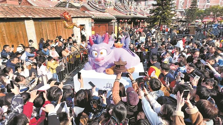 记者看到,活动现场还向游客分发“十龙九子”贴纸。“这些贴纸是‘十龙九子’的设计图,实物更可爱更鲜活,欢迎大家多多关注‘十龙九子’的出街活动。”鲤城区文旅局副局长林菲介绍,除了已经亮相的五个龙生肖艺术装置,1月28日15时“龙众是兄弟”“睚眦”(yá zì)将亮相元妙观,1月29日15时“龙众敖读册”“负屃”(fù xì)将亮相泉州府文庙广场。