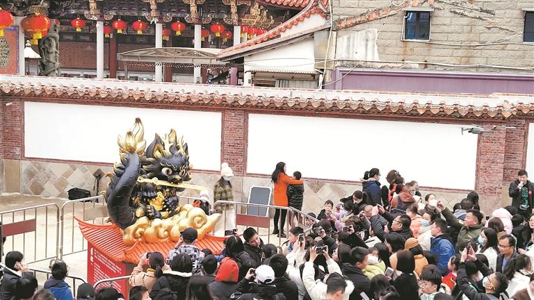 昨日下午3时,冬日暖阳照在泉州东街新府口的元妙观,“十龙九子”龙生肖艺术装置第六件作品“睚眦”(yá zì)在此起彼伏的欢呼声中亮相,吸引市民里三层外三层围观。□融媒体记者 黄墩良 张素萍