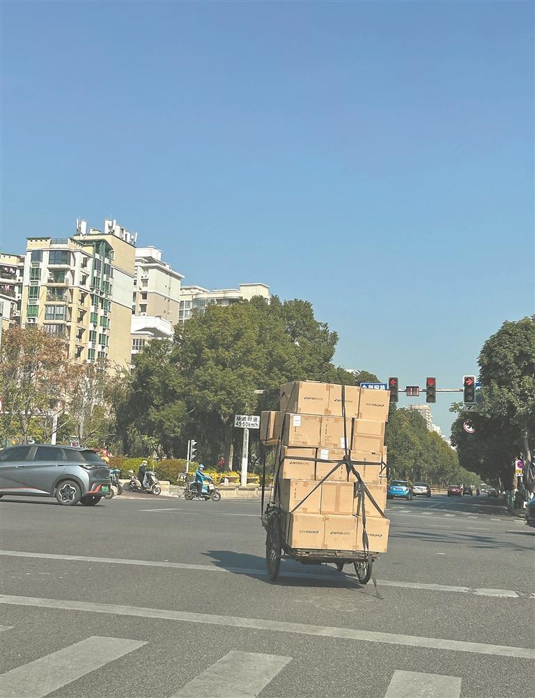 ▲丰泽区刺桐路与泉秀街交叉路口,一辆三轮车载满货物公然闯红灯,实在危险。(吴女士 摄)