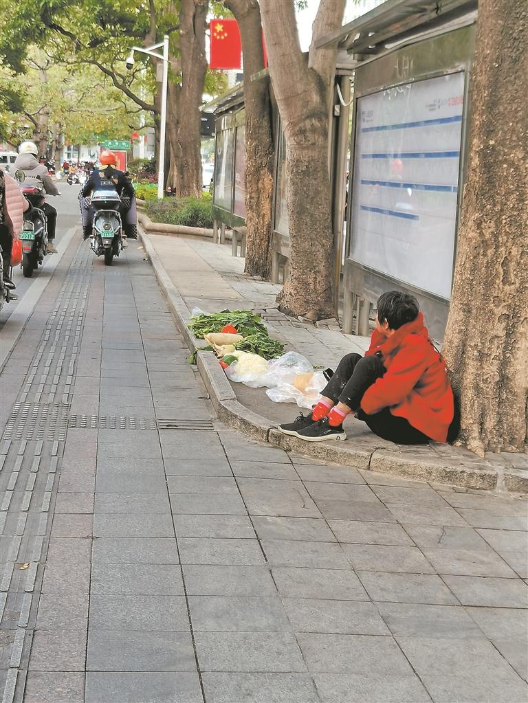 ?一名阿婆在泉州中心市区丰泽街“儿童医院”公交站点摆地摊,将菜摆放在公交候车亭的石板材上。这种行为不仅影响周边环境,而且影响他人候车。(网友“远宝”摄)