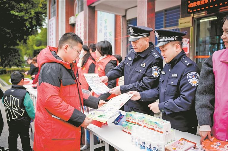 近日,永春县政法委、公安局、检察院、法院、司法局、妇联联合举办“手写百福‘龙’重登场 家家齐聚同贺新春”活动,通过送春联、写“福”字、拍“全家福”、普法宣传等形式,营造全社会共同关心关爱儿童健康成长的良好环境,进一步弘扬中华民族优秀文化,营造喜庆祥和的节日气氛,把新春祝福送到群众手中。图为永春县公安局民警现场进行禁毒、反诈等法治知识宣传。