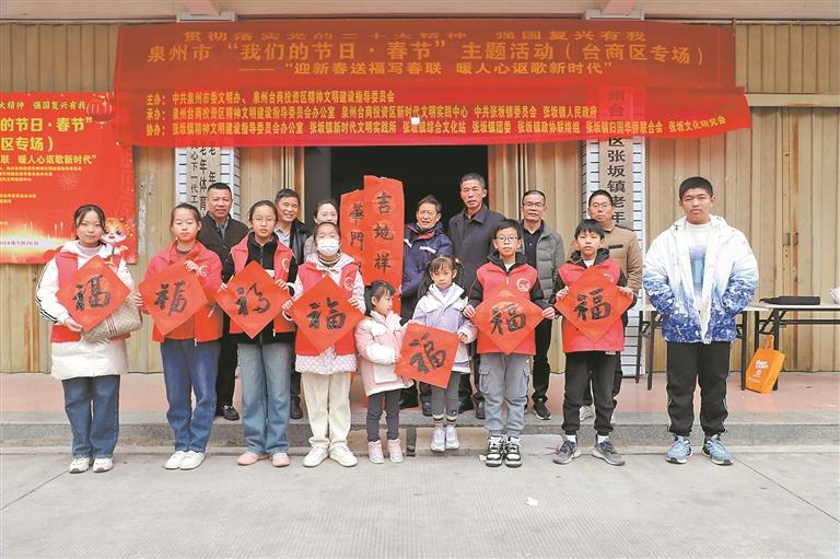 近日,“迎新春送福写春联·暖人心讴歌新时代”送春联主题活动在泉州台商投资区张坂镇举办。张坂镇综合文化站邀请区书法家协会会员、退休教师、书法爱好者现场挥毫泼墨,书写一副副寓意吉祥的春联。志愿者们有的维持秩序,有的帮忙压纸,将对联送给闻讯而来的群众,现场气氛热烈、充满欢乐。当天共送出近900副春联,为春节增添祥和、喜庆的氛围。图为群众展示领到的“福”字。(罗剑生 黄翠阳 摄)