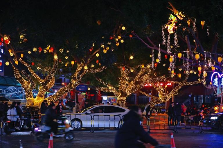 火树银花不夜天,流光溢彩夜辉煌。近日,有不少市民游客纷纷驻足在几棵大榕树下,是怎么回事呢?原来,这几棵大树白天还“平平无奇”,一到晚上就华丽变身,换上璀璨靓丽的新装,吸引了不少市民游客拍照打卡。