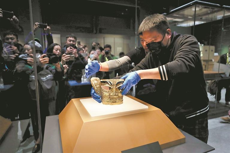 据悉,本次展览共计展出363件/套文物,是古蜀文明考古出土文物在四川省外最大规模的展览。图为工作人员将“金面具”放入展柜。(中新)