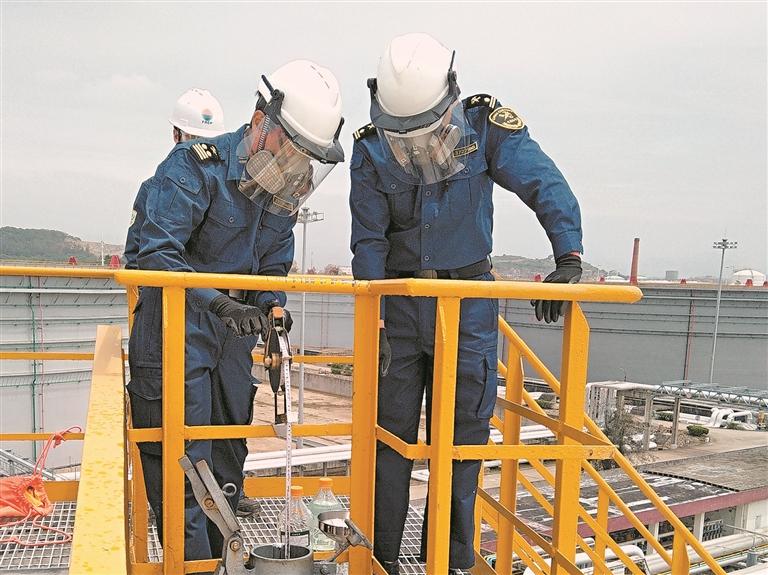 泉州海关工作人员在储罐顶开展出口柴油取样作业 (罗德清 摄)