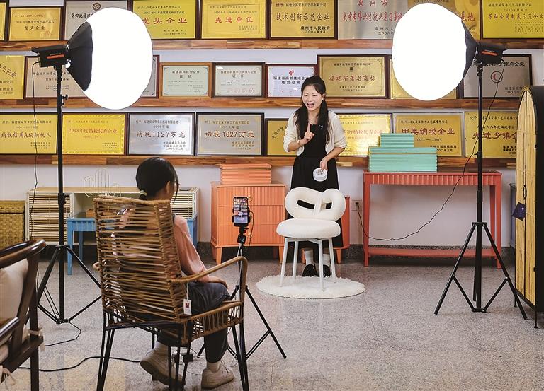 直播在时间和空间上拓展了传统行业的经营半径。近年来,安溪许多传统行业乘势而为,进一步打造品牌直播间,拓展产业发展新渠道,刺激产业复苏。图为聚丰文化艺术馆共享直播空间工作人员正在直播带货。