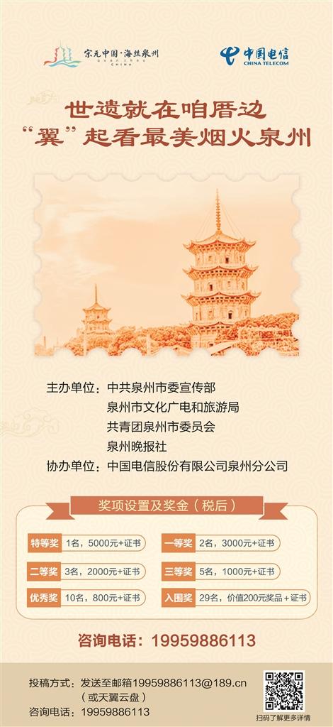 去年恰逢泉州申遗成功两周年,为进一步提升“宋元中国·海丝泉州”城市知名度、辨识度、美誉度,打造“世遗之城”“奋斗之城”“国潮之城”“烟火之城”城市品牌,由中共泉州市委宣传部、泉州市文化广电和旅游局、共青团泉州市委员会、泉州晚报社联合主办,中国电信股份有限公司泉州分公司协办的“世遗就在咱厝边——‘翼’起看最美烟火泉州”短视频大赛拉开序幕。