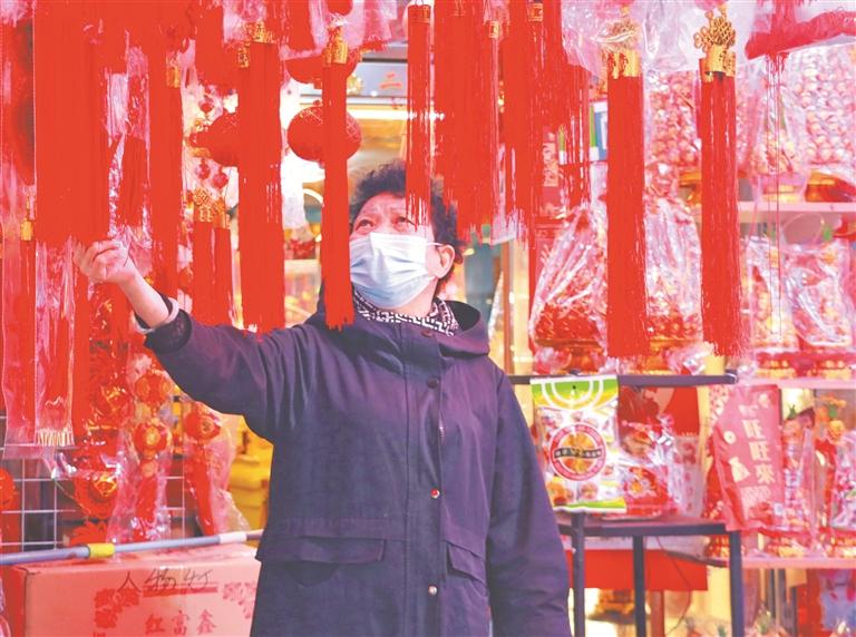 小灯笼串、红辣椒串、中国结……农贸市场卖年货的摊位前挂满各式各样寓意吉祥的挂件,吸引不少群众驻足选购,洋溢着迎禧接福的喜庆气氛和美好祈愿。