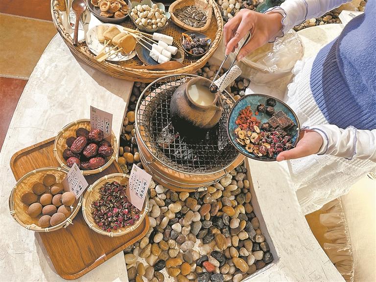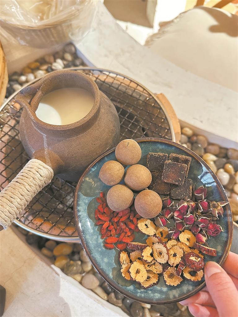 “我觉得,中药奶茶的苗头在‘保温杯里泡枸杞’这句话火起来的那一年就出现了。当时,大家仿佛突然‘觉醒’了,原来贴着中药标签的枸杞成了日常饮品。直到2023年夏天,中药房里的酸梅汤火了,中药奶茶也‘出圈’了。”周末的下午,市民吴小姐和闺蜜团购了一份中药奶茶的围炉煮茶套餐。红枣、桂圆、红糖、枸杞倒入装着鲜奶的罐子中,在炉火中慢慢加热。红枣与桂圆的香气从煮开的鲜奶中散发出来,甘甜却不腻味。