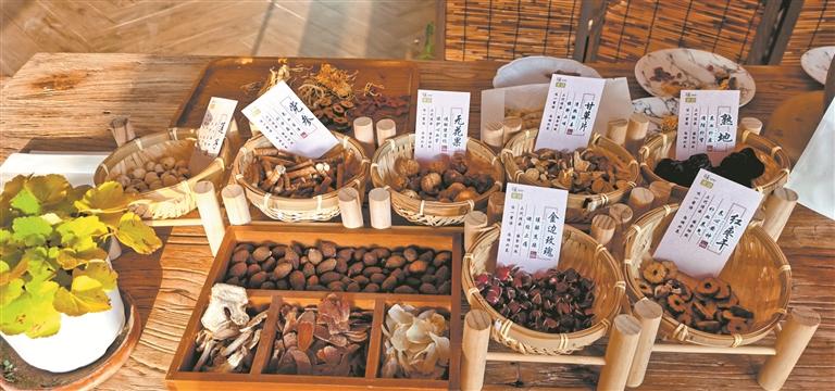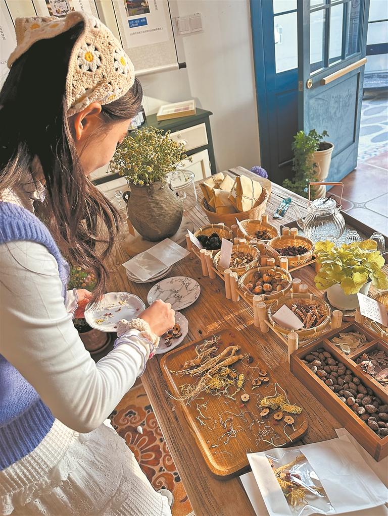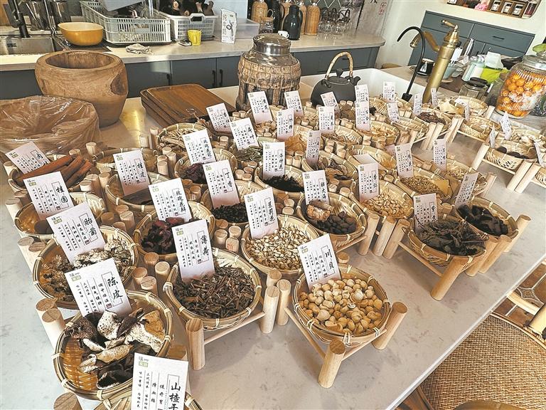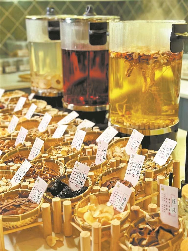 山楂干、陈皮、薄荷、川贝、胖大海、紫苏、杏仁……在中心市区七星街一家小庄园里,点单的吧台上摆着50个小箩筐,每个小框里都有一味中药材。进店的客人看到一桌中药时,大多会先拿起手机打卡拍照。记者了解到,目前店里一共有四款中药奶茶,两款可加奶,另两款不加奶,人参、玫瑰、红枣、怀姜等成为饮品的主角。“这两个月,我们在线上就卖出了3000份左右的中药奶茶套餐。”该店的创始人郑依娜说,2022年,店里开始推出中药奶茶,一推出就很受欢迎,客人的接受度比她想的要高。