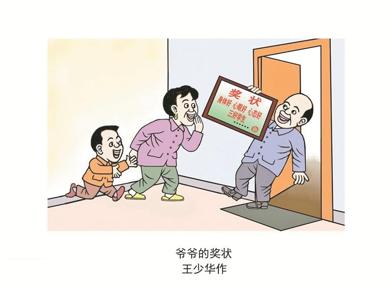据1月30日“半月谈”微信公众号报道,近日,在山东潍坊,爷爷担心孙子拿不到奖状而伤心,于是提前买了一沓奖状,把孙子的优点全写了出来,孩子看后开心得合不拢嘴。其中一个是“三好学生”奖——“身体好,心眼好,心态好”。 (王少华/图)