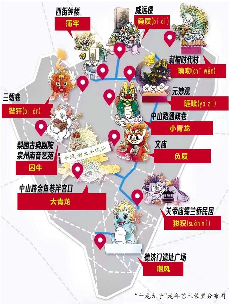 “龙鲤鲤”之大青龙在金鱼巷泮宫口,“龙鲤鲤”之小青龙在通政巷与中山路交叉口。“龙众九子”之“蒲牢”在西街钟楼附近,“龙众九子”之“赑屃”在威远楼,“龙众九子”之“囚牛”在梨园古典剧院、泉州南音艺苑,“龙众九子”之“嘲风”在德济门遗址广场,“龙众九子”之“狻猊”在关岳庙锡兰侨民旧居前空地,“龙众九子”之“睚眦”东街元妙观周边空地广场,“龙众九子”之“负屃”在府文庙前广场,“龙众九子”之“螭吻”在刺桐时代村,“龙众九子”之“狴犴”在三朝巷。