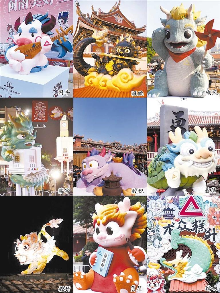 看寓意。“十龙九子”中的“龙众九子”是以《山海经》记载的龙生九子为灵感,将经典神话故事与现代风格巧妙融合,通过古籍中龙九子的描述,设计创作出形态各异、特点鲜明的全新系列形象。“龙众”谐音闽南语“拢总”,是“全部”“都”的意思,设计团队给每一位“龙子”都赋予闽南特有祝福。如“囚牛”为“龙众水铛铛”,“睚眦”为“龙众是兄弟”,“嘲风”为“龙众平安无代志”,“蒲牢”为“龙众起大厝”,“狻猊”为“龙众趁大钱”,“赑屃”为“龙众勇”,“狴犴”为“龙众灯场”,“负屃”为“龙众(上敖+下力)读册”,“螭吻”为“龙众糕升”。“龙鲤鲤”象征万物“拢总好”之意。