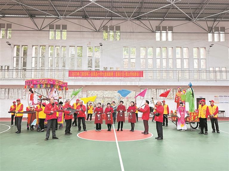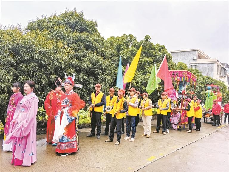 “前面的队伍稍微慢些,后面的队伍紧跟上去,大家步伐保持一致。”彩排现场,身着鲜艳服饰的巡游队伍聚在一起,紧锣密鼓地彩排预演着,现场锣鼓阵阵、南音袅袅,场面相当喜庆热闹,吸引了附近村民前来观看。