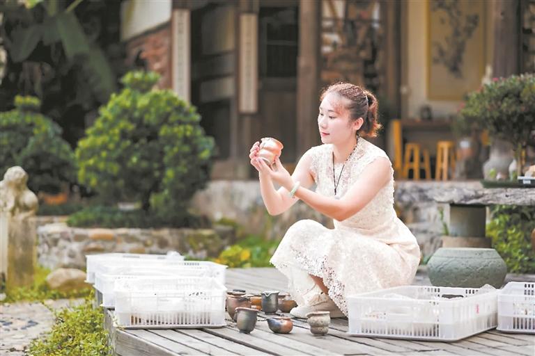 “我们庭院主要是以修旧如旧的场景来打造。我是泉州人,而红砖是泉州的一个文化符号,所以庭院外面以红色为主体,外部效果以枯山水的整体意境来设计,庭院有水,有灵气,呈现自然、山村的视觉效果。”全国陶瓷技术能手李长春说,这个庭院本身自然朴拙,柴烧作品属于明火直烧,一样自然朴拙。此外,这个庭院后面有3栋老房子还没改造,未来将打造成旅游观光和度假舒适酒店。