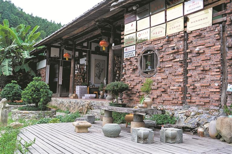 据庭院主理人李长春介绍,10年前,他来到德化,就被德化陶瓷柴烧技艺所吸引。他认为柴烧器皿是大自然的恩赐,选用的陶土、木柴燃料都源于大自然,有一种粗犷质朴、色泽温润的感觉。经过多方考察,他最终相中了风光秀丽的石鼓村,修葺打理了这座古朴典雅的柴烧小院。