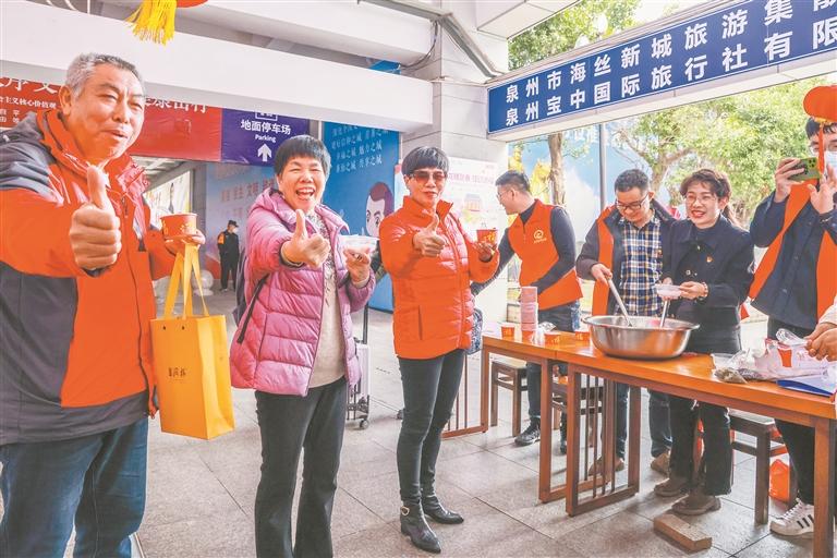 昨日,活跃在新时代文明实践基地的“马甲红”们,让刚下车的旅客们感受到了暖暖的泉州情。20多名志愿者在基地煮好汤圆,带上环保碗,来到风雨连廊临时志愿服务点。志愿者一边向过往的游客分发热腾腾的泉州汤圆,一边分发泉州旅游地图、宣传页。还有书法家们现场泼墨,书写春联,赠送给游客。“除了300多份汤圆、上百副春联,我们还送出泉州伴手礼,像小灯笼、剪纸等新年挂饰,还有文具盲盒等小礼品。”