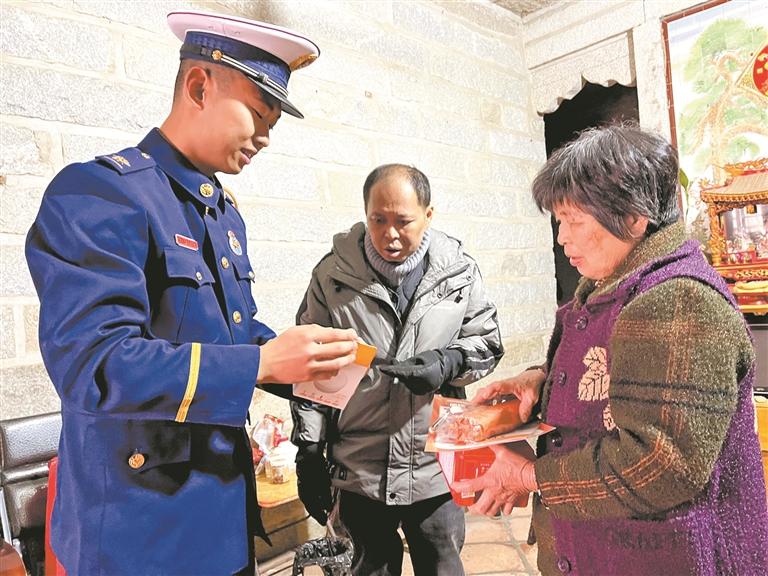 活动组织了100余名志愿者,将筹集到的大米、食用油等生活物资以及春联礼包等慰问品逐户送到独居老人手中,并亲切询问他们的身体健康状况,送上新年祝福。消防指战员则送上烟感报警器、防烟面罩等消防物资,一一示范使用方法和注意事项,宣讲消防安全知识。