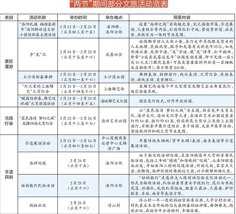 本报讯 (融媒体记者罗剑生 林铭珊)春节、元宵节期间,泉州台商投资区以宝龙城市广场、中心商圈两大商圈和洛阳桥、海丝艺术公园、八仙过海度假区、玉沙湾、浮石隐地等景区为阵地,点面开花,开展具有海丝、滨海、闽南特色的文旅活动,包含景区漫游、元宵灯会、非遗民俗、群众文化等八大方面系列活动51场,为广大群众带来新春的欢乐与祝福。