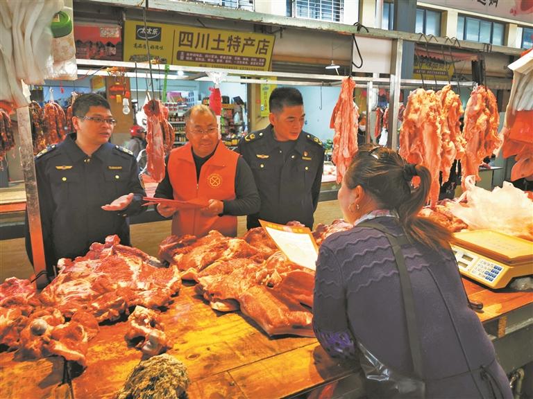 执法人员和志愿者了解猪肉价格,倡议商户文明经营。