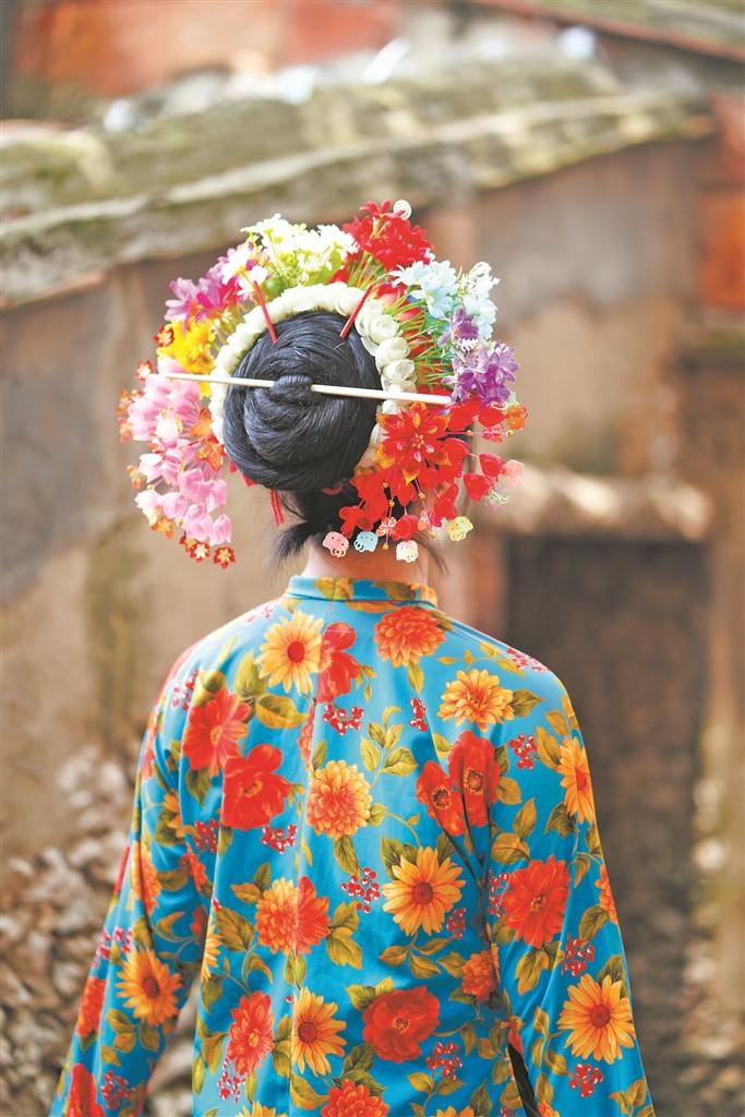蟳埔女是福建三大渔女之一,至今仍保留着头戴簪花围的习俗。“蟳埔女自打孩提时期,便将头发留长,系上红绳,穿上骨髻,插上发钗,另用鲜花串成花环,圈戴在脑后,簪出一个‘头上花园’,鲜艳芬芳。”黄丽泳是赵丽颖的造型师,多年来一直致力推广蟳埔文化,她说,簪花围承载着渔家人的情感与记忆,体现着蟳埔女的勤劳质朴以及对美好生活的向往。