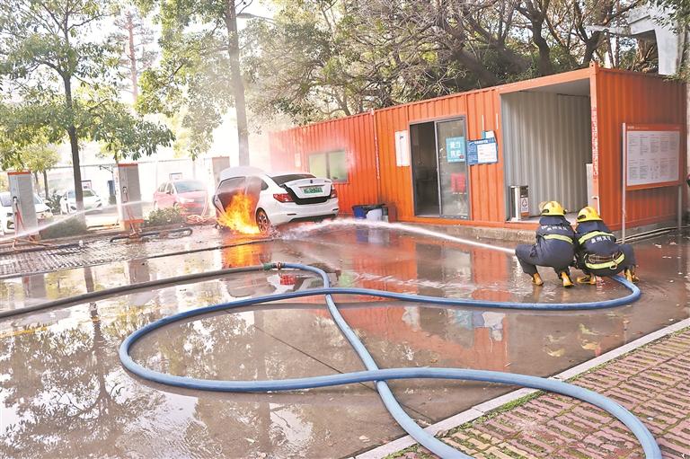 本报讯 (融媒体记者陈明华 通讯员李军阳 文/图)昨日14时58分,在丰泽区城东街道安吉南路一充电站内,一辆新能源小轿车充电时突然失火。丰泽区城东消防救援站接警后,立即出动消防救援人员赶到现场处置。