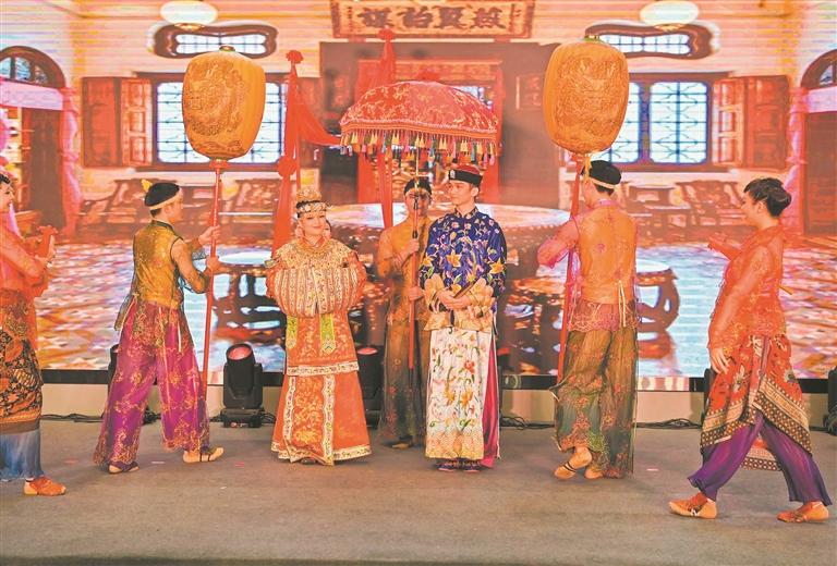 近日,由新加坡旅游局、福建省侨联、晋江市人民政府共同主办的第三届南洋文化节暨新加坡梧林娘惹文化季活动在晋江梧林传统村落启动,开启为期24天的娘惹风情大赏。启动仪式上,晋江为首批文旅推荐官授牌。图为现场演出的娘惹婚礼舞剧《婚礼:忆向南洋》。(融媒体记者许雅玲 丁荣汉 摄)