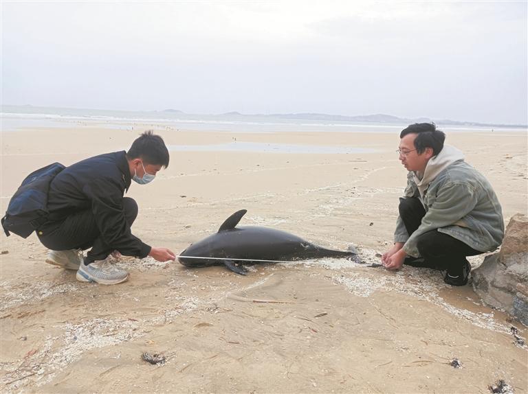 发现海豚的沙滩分别位于赤土尾村一带和墩南村、东洋村交界处。接到反映后,惠安县净峰镇渔业办、县农业农村局农业综合执法大队等相关部门人员迅速赶到现场调查处理。