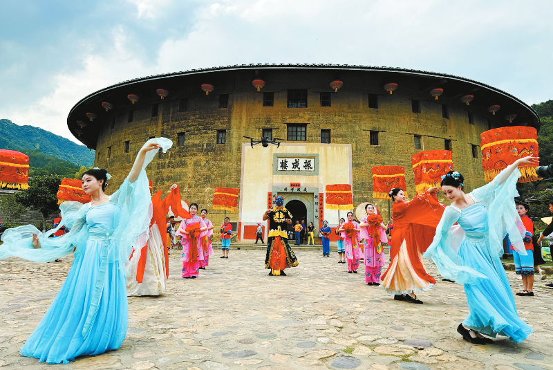 连日来,福建土楼永定土楼景区精心组织的“永定走古事?土楼话传承”非遗活动表演正在紧张排演中,别样的风土人情吸引了许多游客围观。“五一”小长假即将到来,永定土楼景区组织排演了一批精彩民俗活动,让游客们可以观奇楼美景、赏精彩民俗,畅享多姿多彩的假日时光。 通讯员 黄秋萍 摄