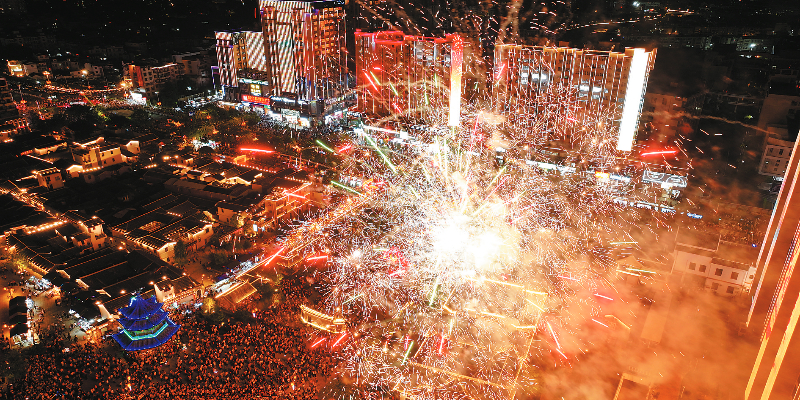 5月2日晚,连城县四角井历史文化街区上演一场璀璨的烟花秀。1日-2日晚,四角井历史文化街区化身光影剧场,以璀璨灯火为幕布,以多彩非遗为笔触,匠心演绎“非遗奇妙夜”文化盛典,通过动态展演、沉浸体验等多元形式,让游客和市民在传统与现代的碰撞中触摸历史温度。 通讯员 江钰婷 叶先锋 摄