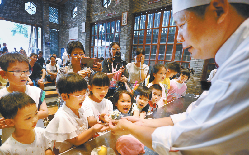 5月2日,在广东省佛山市禅城区南风古灶旅游休闲街区,孩子们在观看粤菜师傅制作特色点心“狮头包”。“五一”假期期间,各地推出丰富多彩的旅游产品供给,旅游消费欣欣向荣。新华社发 黄继明 摄