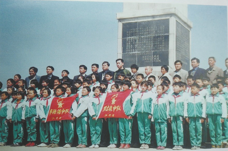 江苏溧阳后周中心小学为纪念罗忠毅、廖海涛,成立了罗忠毅、廖海涛中队。图为当地党政领导与少先队员在烈士碑前合影。(资料图)