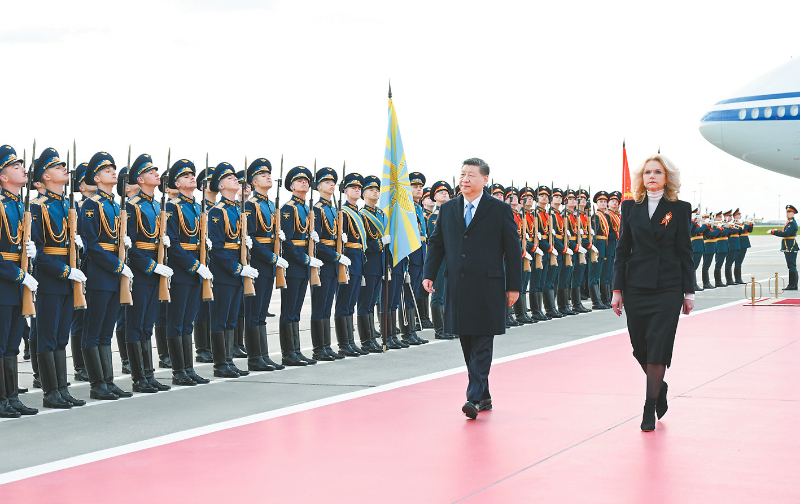 俄方在机场举行隆重迎接仪式。军乐团奏中俄两国国歌。习近平检阅仪仗队并观看分列式。