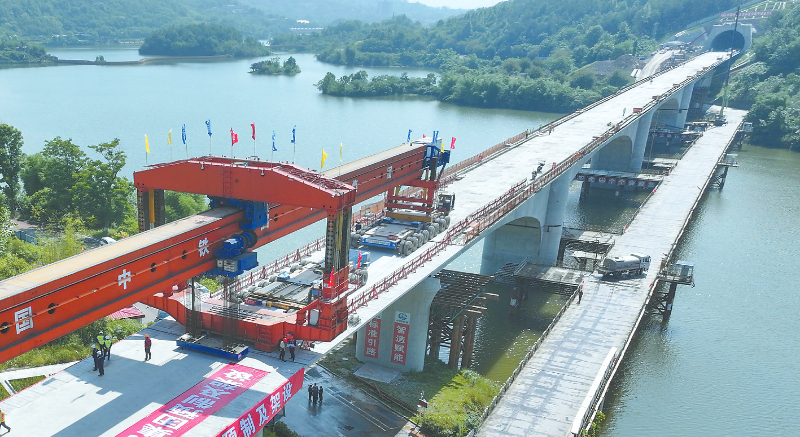 5月7日,在成渝中线高铁玄天湖双线大桥建设现场,架梁机在架设最后一孔箱梁(无人机照片)。当日,随着玄天湖双线大桥最后一孔箱梁架设完成,由中铁五局承建的成渝中线高铁玄天湖双线大桥顺利贯通,为后续无砟轨道施工奠定了坚实基础。玄天湖双线大桥位于重庆市铜梁区玄天湖4A级景区内。玄天湖双线大桥连续梁全部采用我国新一代智能悬臂造桥机施工,较传统工艺降低高空作业风险50%以上,施工效率提升15%。成渝中线高铁是我国“八纵八横”高铁网沿江通道的重要组成部分,正线全长292公里,设计时速350公里。新华社记者 唐奕 摄