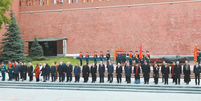 庆典结束后,习近平同其他国家领导人一起从红场来到亚历山大花园,向无名烈士墓献花,并肃立默哀。随后,各国领导人集体合影留念。