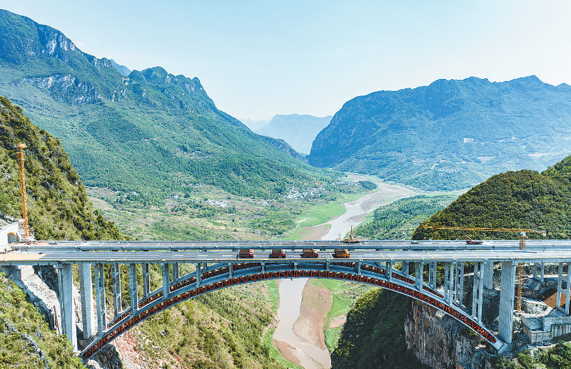 5月17日,乌蒙山大桥进行静态荷载试验(无人机照片)。当日,由贵州公路集团承建的纳晴高速乌蒙山大桥开始进行静态荷载试验,12辆负载砂石的大型货车有序行驶到固定位置进行对称、偏心检测,检验桥梁结构受力性能和实际承载能力,为桥梁竣工验收提供科学依据。乌蒙山大桥是纳雍至晴隆高速公路重点控制性工程,主桥跨径270米,设计时速100公里。