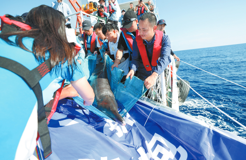 6月8日,救助人员将糙齿海豚“阳阳”放归大海。当日,在海南三亚获得救助的糙齿海豚“阳阳”被成功放归大海。4月24日,这头糙齿海豚在三亚亚龙湾青梅港不幸搁浅,随后多方力量迅速展开救援行动,将其送往生物保育中心接受专业的治疗与护理。经过一个多月的悉心照料,“阳阳”已恢复健康状态,可以被放归野外。经专家组讨论后,“阳阳”被运往一处适合其生活的海域放归。此次放归表明三亚鲸豚救助网络不断完善,也为今后的海洋生物保护工作积累了宝贵经验。新华社记者 张丽芸 摄