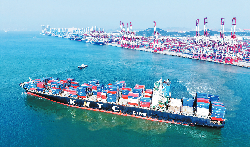 近日,山东港口青岛港,装载外贸集装箱的货轮驶出港口(无人机照片)。新华社发 俞方平 摄