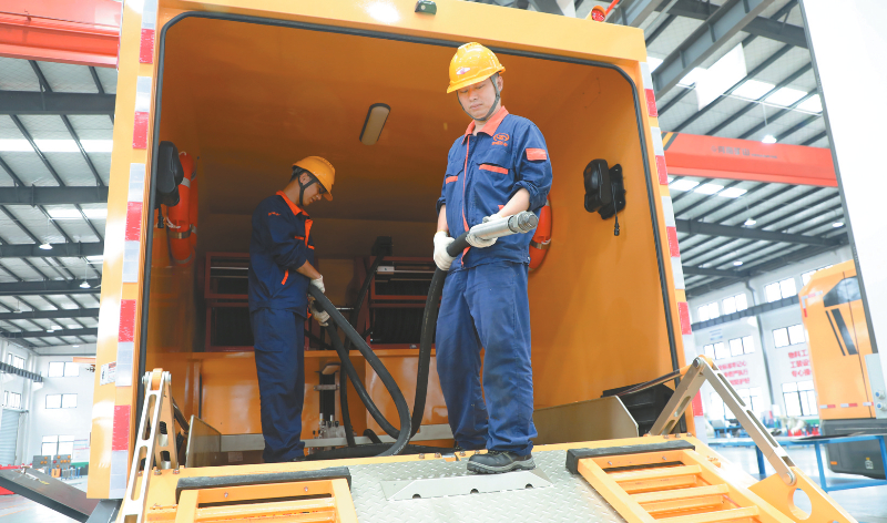 近日,在国家级专精特新“小巨人”企业——侨龙应急厂房内,工人正在搬运抽水管。作为全国液压驱动供排水应急装备的行业标准制定者,该公司主导制订《排水抢险车》国家标准,其核心产品填补国内外技术空白,性能达国际领先水平。去年,企业产值突破10.48亿元,技术研 发 人 员 占 比 超24%。通讯员 俞晓芬 摄