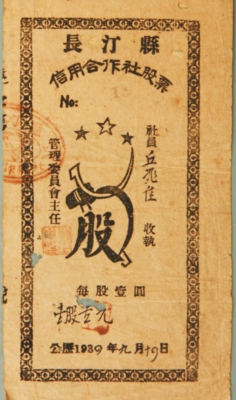 丘兆佳持有的苏区时期长汀县信用合作社壹元股票