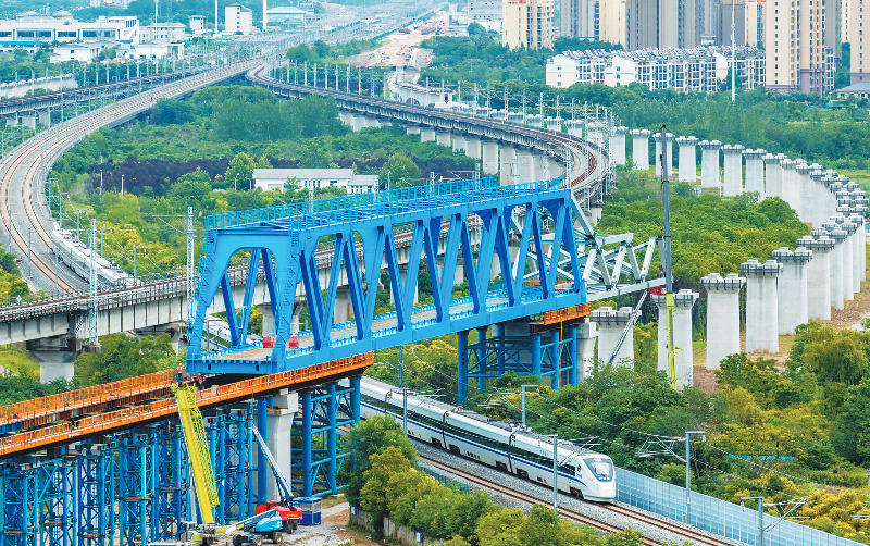 新建沪宁合高铁钢桁梁跨越沪蓉铁路(6月15日摄,无人机照片)。6月15日凌晨,由中铁四局承建的新建上海至南京至合肥高铁重达近千吨的钢桁梁成功跨越沪蓉铁路,为后续架梁施工奠定基础。据悉,新建上海至南京至合肥高速铁路是国家中长期铁路网规划“八纵八横”中沿江通道的重要组成部分,是江北沿江城市与南京都市圈、上海都市圈快速直达的快捷通道。 新华社发 刘玉才 摄