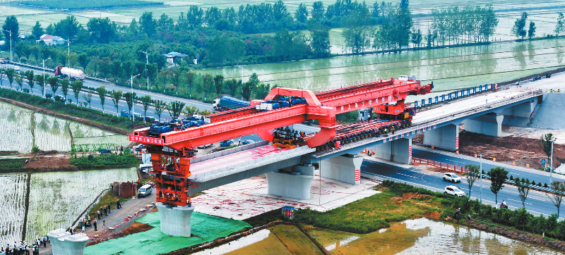 6月21日,在潍宿高铁郯城沭河特大桥施工现场,中铁上海局工作人员在进行箱梁架设(无人机照片)。当日,潍(坊)宿(迁)高铁山东临沂段首榀箱梁架设成功,正式进入线上架梁施工阶段。据悉,潍宿高铁是京沪高铁辅助通道的重要组成部分。新华社记者 郭绪雷 摄