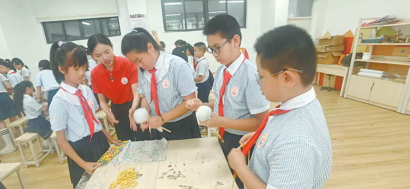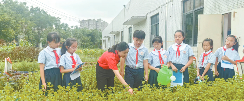 校园里的“百草园”是学生们的实践乐园。科学老师黄海珊带着学生在薄荷种植区授课:“大家闻一闻、摸一摸,薄荷有清凉的气味,叶面粗糙、边缘呈锯齿状。”学生谢雨萱说:“在户外上课能让我们亲手浇水、除草、驱虫,通过观察草药的叶子、气味和茎,学到了很多知识。”数学课上,学生们会计算薄荷种植的株距、行距,规划种植面积;美术课上,他们用画笔描绘中草药的形态;劳技课上,大家一起制作艾草锤。“制作艾草锤时,我知道了艾草能祛湿除寒,也体会到了团队合作的重要性。”学生林诗佳说。