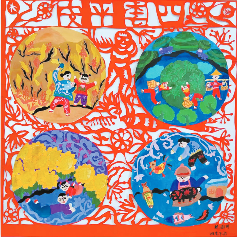 《四季平安》以剪纸镂空衬底,四幅圆形画作嵌于其间。春种秋收、农闲节庆跃动于斑斓色块中,拙朴线条勾勒出乡土生活的和美图卷。