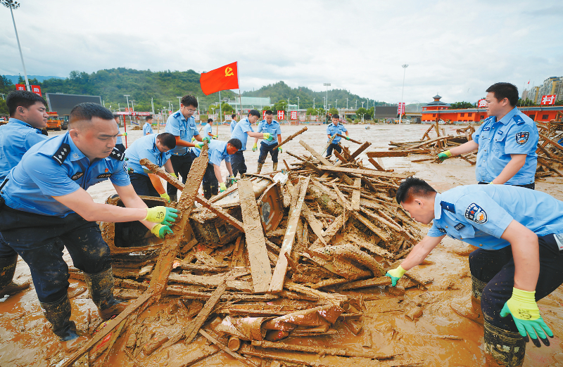 6月29日,在贵州省榕江县“村超”球场,来自丹寨县公安局的党员民警潘建航(左二)和同事一起清理因洪灾受损的球场设施。贵州省榕江县发生特大洪涝灾害以来,共产党员们冲锋在前,在急难险重任务面前勇挑重担,党旗在榕江抗洪一线高高飘扬。 新华社发 杨武魁 摄