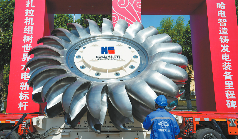 7月2日,在哈电集团哈尔滨电机厂有限责任公司厂区,工作人员指挥调整转轮位置。近日,世界首台单机500兆瓦扎拉水电站冲击式水轮发电机组转轮在哈电集团哈尔滨电机厂有限责任公司自主研制成功,并于7月2日发运,标志着我国在高水头、大容量冲击式水轮机组核心装备领域实现历史性突破。