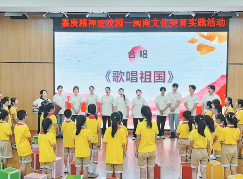 在实验小学和中区小学的活动中,实践队精心设计了系列特色节目:欢快的闽南童谣《一只鸟仔》教学,让孩子们领略了闽南文化的独特魅力;原创朗诵《颂嘉庚精神,铸教育丰碑》深情诠释了嘉庚精神的伟大内涵;吉他二重奏《Like a Star》以动人旋律展现嘉庚先生如星辰般闪耀的教育情怀。原创歌曲《嘉庚燃梦》、歌仔说唱《嘉庚精神育诚毅》以及小提琴二重奏《我和我的祖国》与合唱《歌唱祖国》激发了现场师生的爱国热情。