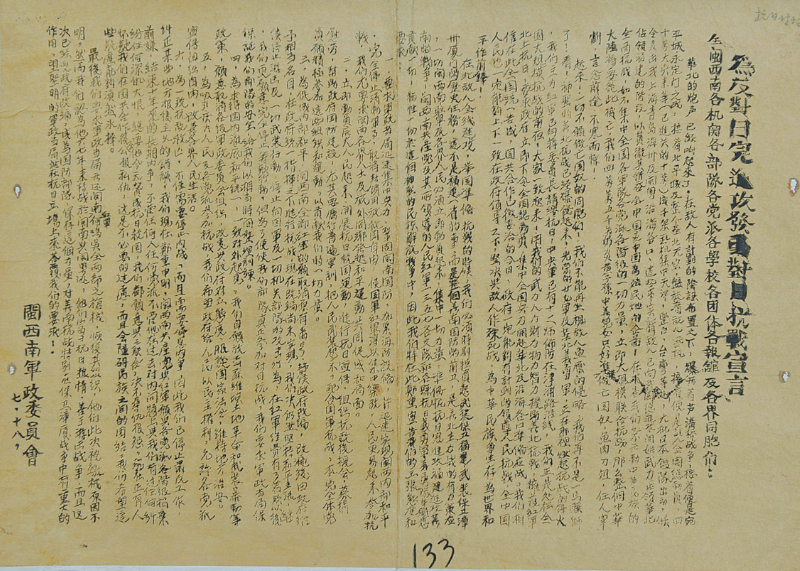 同年7月18日,闽西南军政委员会发布了《为反对日寇进攻发动对日抗战宣言》,郑重宣告:闽西南共产党及其所领导的人民红军一、三、五、七各支队和各县抗日义勇军、义勇队等愿意贡献一切,牺牲一切于这个神圣的民族解放斗争中,并郑重申明:“愿与各党派各阶级捐弃前嫌,结束十年来的长期内争,不管任何人任何党派,不管他过去对内问题上与我们有过任何纠纷,任何深仇大恨,只要我们赞成抗日救国,我们都愿意与之联合,决不寻仇抱怨”,要求“立即动员广大人民起来,开展抗日救亡运动”。宣言在闽西人民中不胫而走,广为流传,鼓舞了闽西人民的抗日勇气。